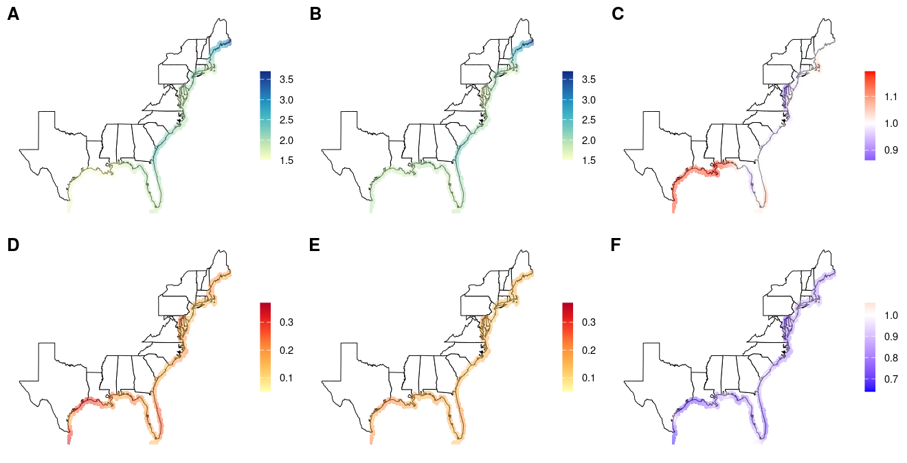 Heat-map panels comparing spatial fields and standard errors for 100-year detided sea-level estimates along the U.S. East Coast, before and after data integration. (A) 3-D Gaussian Process (GP) model fit using only observations; (B) 6-D GP model fit combining observations with simulated model output; (C) ratio (B/A). (D, E) corresponding standard errors; (F) ratio (E/D)